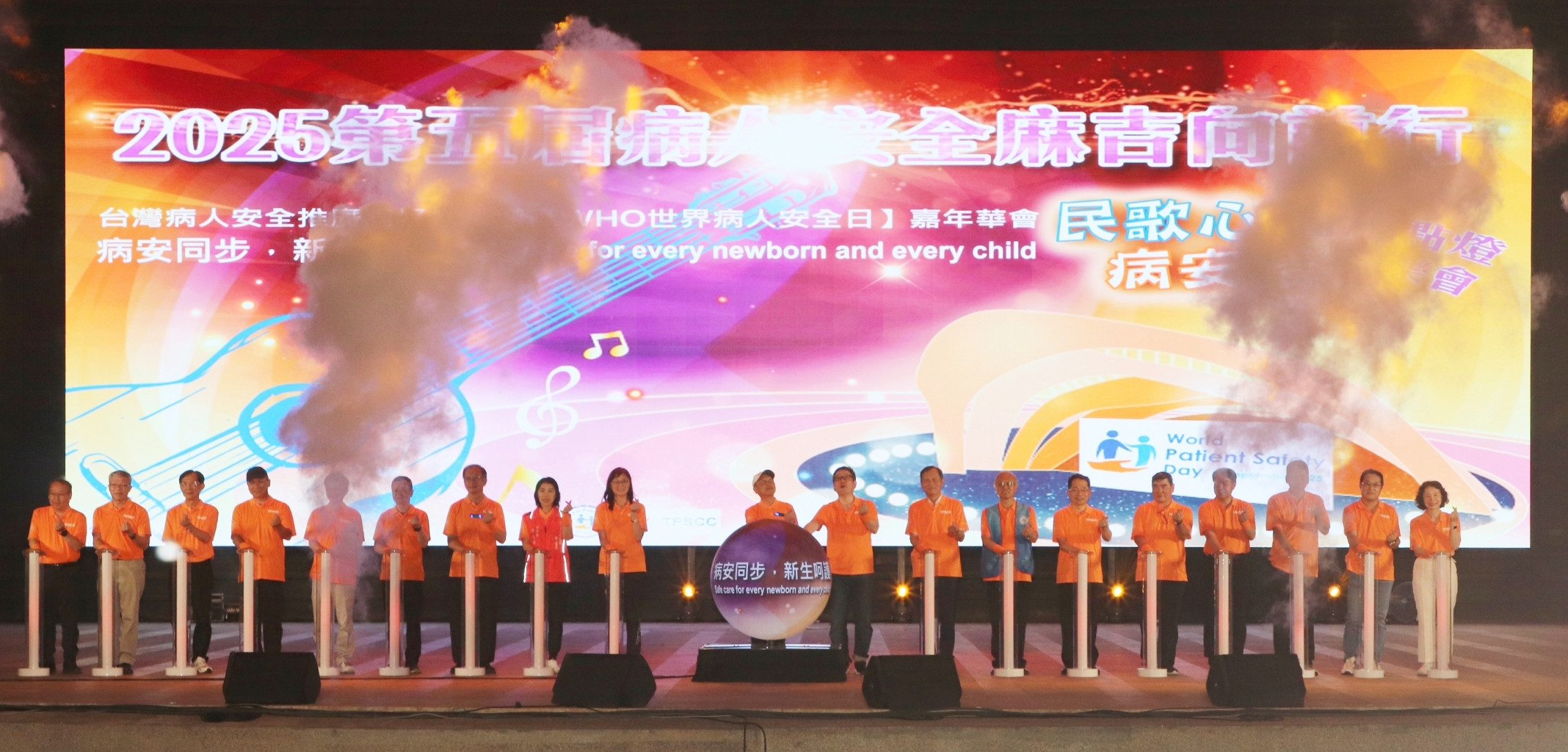 2025第五屆病人安全麻吉向前行–民歌心,病安情:圓滿點燈音樂會活動,12日下午於台中市文心森林公園登場,廣邀各大醫療照護院所醫護人員、志工、相關照護工作人士及民眾近千人共襄盛舉。這場響應WHO世界病人安全日的嘉年華會以「寶貝初生,安全護身」為主題,「病安同步,新生呵護」為口號,透過健走、民歌演唱和市集等多元形式,提升醫護界及社會大眾對病人安全的重視,達成「為每個新生兒和兒童提供安全照護」的核心目標。每年9月17日是世界衛生組織WHO世界病人安全日,呼籲提高民眾對病人安全意識,加強醫療照護機構關注,建議各國在當地代表性公共空間或醒目大型建築物以「橙色」點燈響應。台灣病人安全推廣同好會(TPSCC)自2020年起積極參與,從台中國家歌劇院「壺中居」、台中科湳橋到台中圓滿劇場,皆點亮象徵病人安全的橙光。