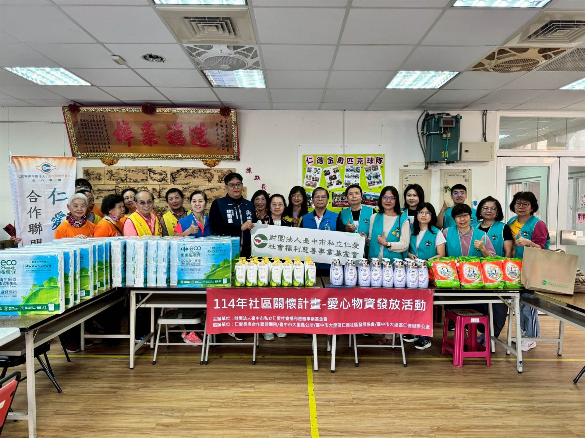 財團法人臺中市私立仁愛社會福利慈善基金會與仁愛長庚合作聯盟醫院(大里仁愛醫院)於今年二度合作,加上仁德社區發展協會許瑞風總幹事帶領社區志工協助,日前三個單位協力於仁德里社區活動中心聯合舉辦「關懷低收獨老愛心物資發放活動」。該活動透過定點發放生活物資,搭配仁愛醫院健康量測血壓與親切問候,不僅透過物資提供民生傳遞溫暖,更實際守護長輩的生活與健康。大里區公所社會課陳文幸課長也親自蒞臨會場,並給予活動豐富的指導與建議,對仁愛基金會深入社區關懷大里區獨老的長輩表達肯定與支持,展現政府與民間攜手關懷弱勢、照顧長者的具體行動。