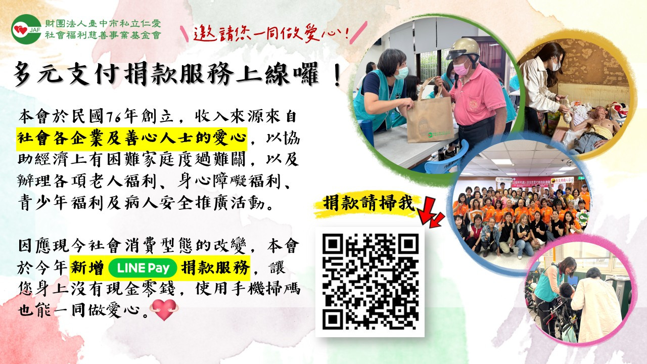 仁愛基金會已創會近40年,致力於各項領域的弱勢協助,貧病醫療協助、社區及老人福利、青少年福利服務及身心障礙者服務,收入均來自社會大眾善心人士的捐助,因應社會消費型態的改變,今年度新增line pay捐款服務,用手機掃碼即可捐款捐助,用更便利的方式邀請您們一同做愛心!❤️