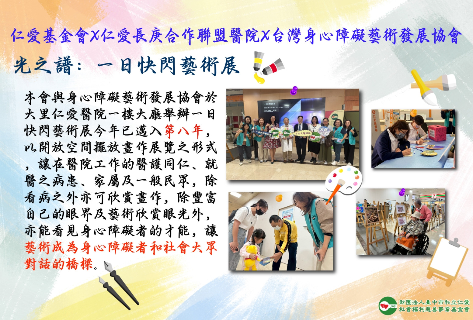 由本會與仁愛長庚合作聯盟醫院與台灣身心障礙藝術發展協會攜手合作,於大里仁愛醫院一樓大廳辦理一日快閃藝術展,為特殊族群在藝術創作上建造的舞台,讓藝術成為身心障礙者和社會大眾對話的橋樑,可以透過作品了解到他們傑出的天賦和努力的成果,不讓其才華潛能被低估和忽略。鼓勵更多身心障礙者以自己的方式持續投入社會參與,展現其生活、文化以及自我認同,並創造經濟自立的機會,建立一個對等看待、相互激勵、實踐生命價值與意義。讓更多人可以看見身心障礙者的世界裡多元及綺麗。
