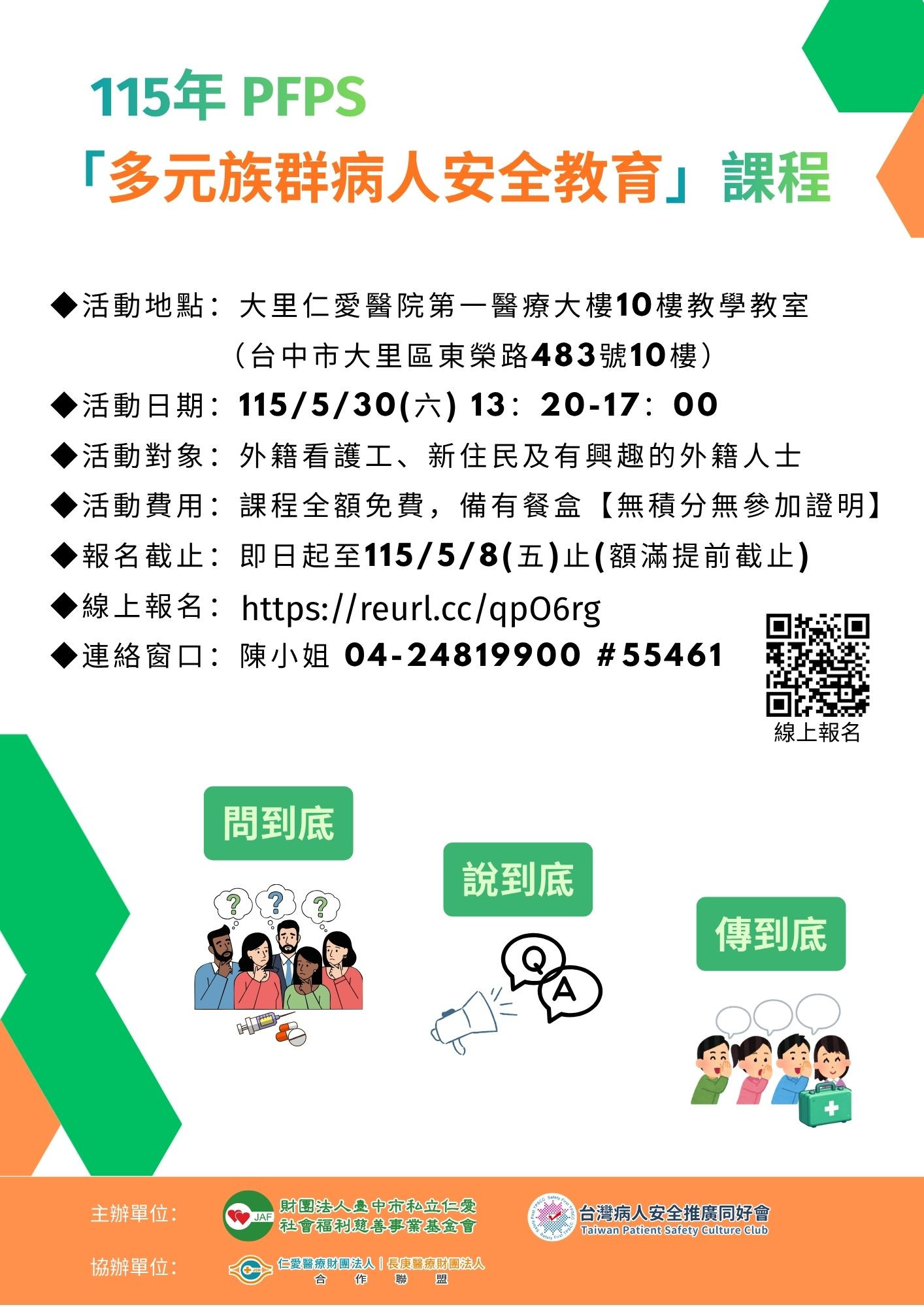 ✍️【活動預告】115 年PFPS「多元族群病人安全教育」課程來囉!