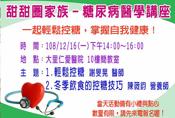 甜甜圈家族-糖尿病醫學講座 本會有鑒於糖尿病歷年皆列入十大死因中,糖尿病持續對於民眾之威脅,特成立「糖尿病病友團體」...