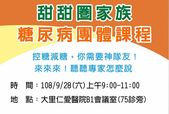 甜蜜俱樂部-健康講座 日期:108年10月16日(星期三) 時間:下午14:00~16:00 地點:台中仁愛醫院-行政大樓5樓 主題: (1)代...
