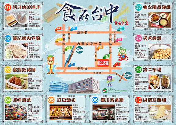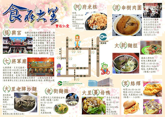 結合食在大里地圖製作,配合在地資源進行行銷與廣宣。希望藉由一份文宣品帶來熱烈的迴響,不但能讓在地人感受到「食」在大里,也是「實」在大里,讓大里區的在地小吃更為家喻戶曉,讓食在大里傳承世代對鄉土不變的情懷!根據這樣的構想,除了呈現美食地圖的便利性外,能突顯出在地的人文風情;同時藉由美食、景點的介紹,延伸出老、中、青三代對大里區地方情感的認同。